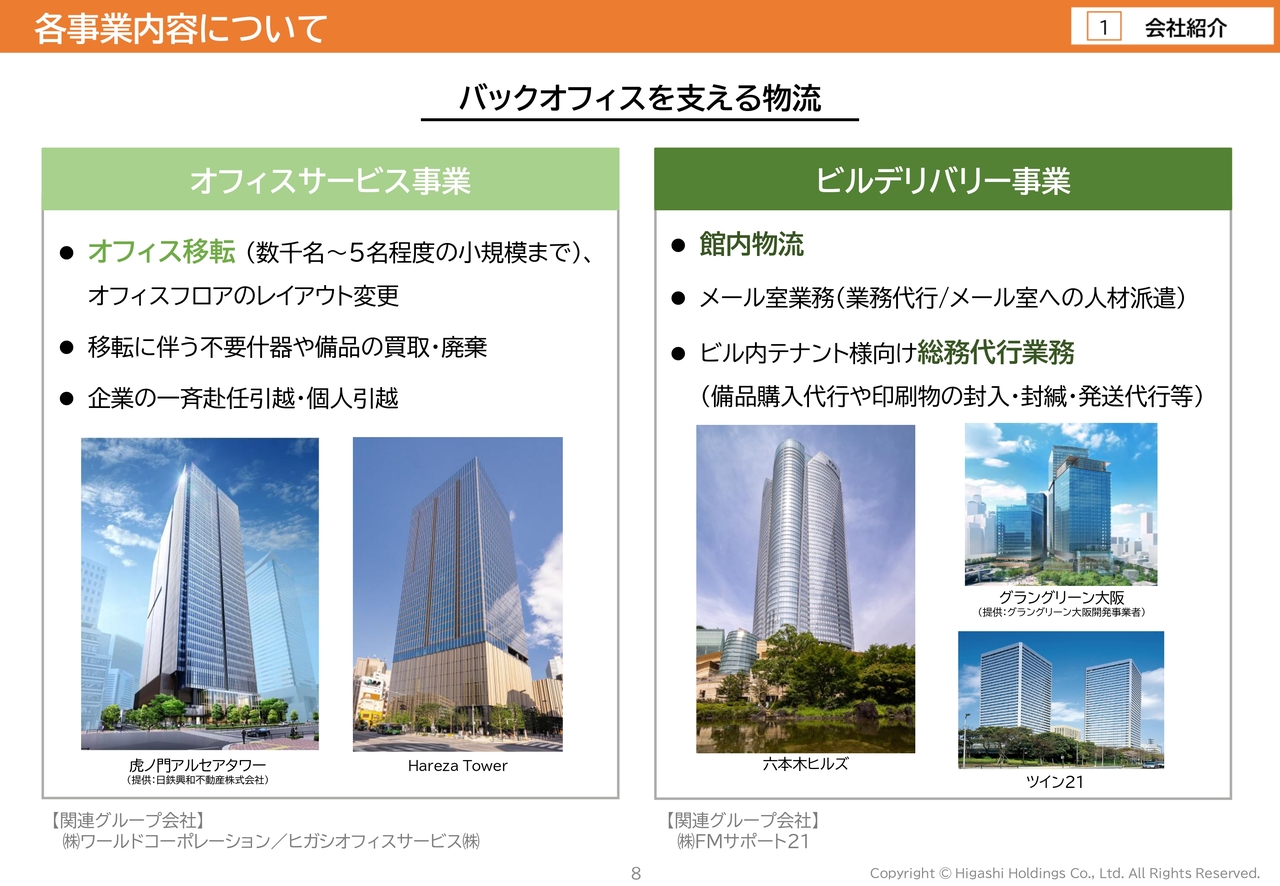 近年の都心部における大規模再開発の機会を捉え、ビルデリバリー拠点の拡大を着実に進めており、虎ノ門アルセアタワーや赤坂トラストタワーといった新拠点での業務を開始しています。
