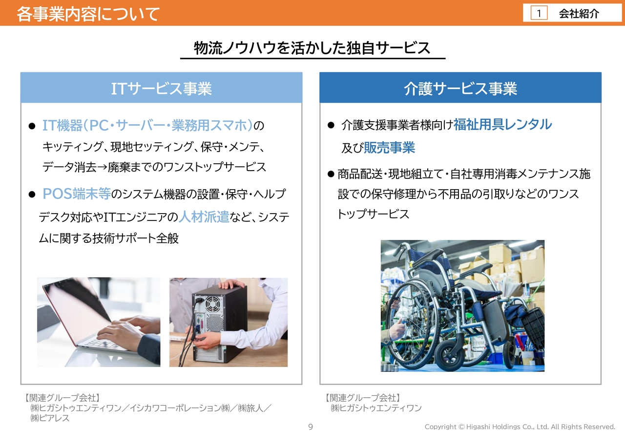 児島:物流事業から派生した独自サービスとして、ITサービス事業と介護サービス事業があります。ITサービス事業では、IT機器の導入から廃棄まで一連のサービスをワンストップで提供しており、企業だけでなく、自治体なども含めた、さまざまなお客さまからご依頼をいただいています。