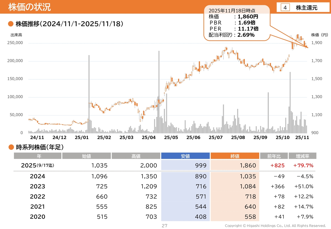 続いて、直近の株価についてです。スライド上部に2025年11月18日の終値を記載しています。株価1,860円、PBR1.69倍、PER11.17倍、配当利回り2.69パーセントとなっています。なお、11月6日には取引時間中に上場来高値2,000円を記録しました。