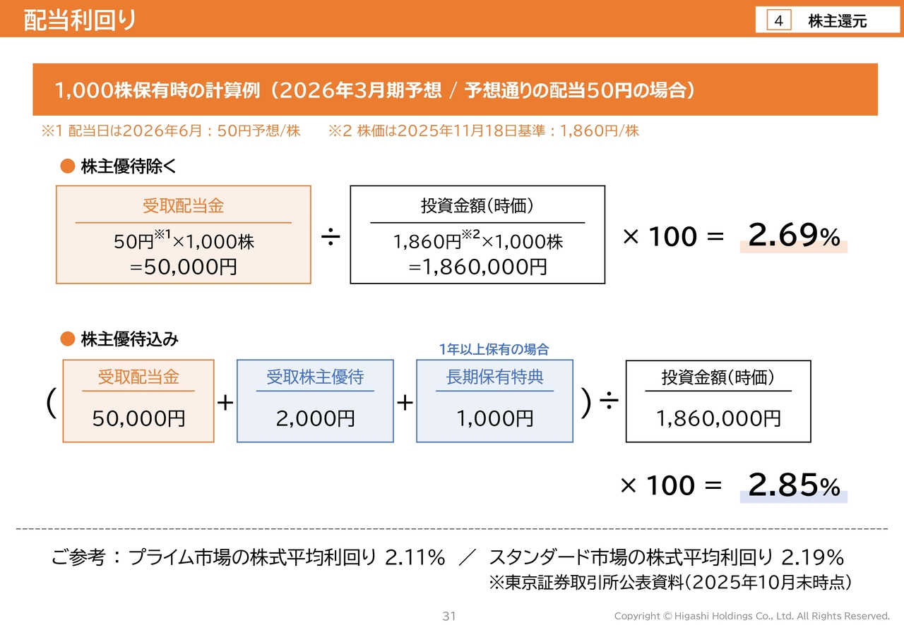 児島:配当利回りについてですが、2026年3月期に予想配当50円が実施された場合、2025年11月18日時点で1,000株を保有しているケースでは、株主優待を除いた配当利回りが2.69パーセントとなり、2025年10月末のプライム市場およびスタンダード市場の平均利回りを上回る状況です。
