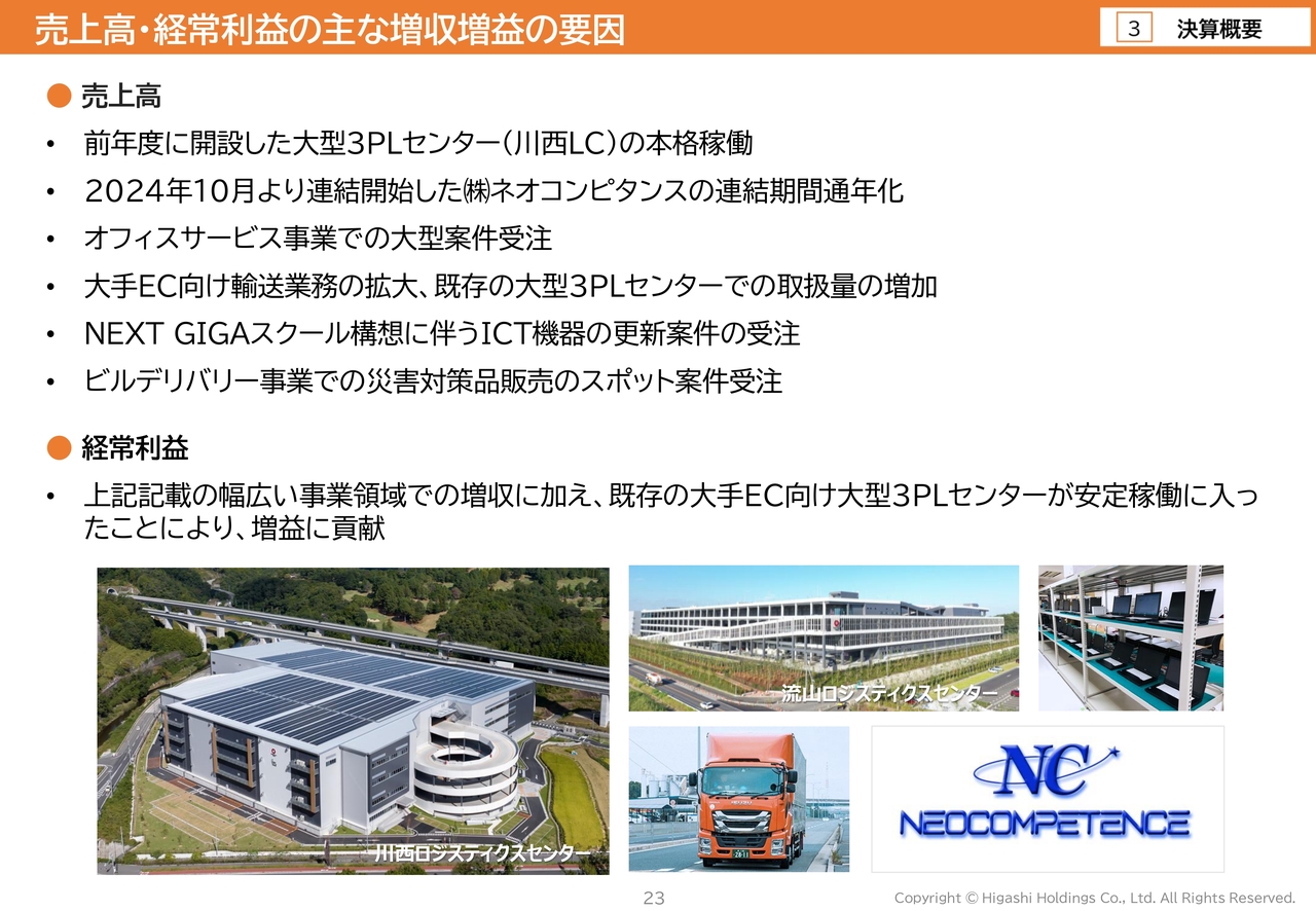 また、経常利益は、このような幅広い事業領域での増収に加え、既存の大手EC向け大型3PLセンターが安定稼働に入ったことにより増益となっています。