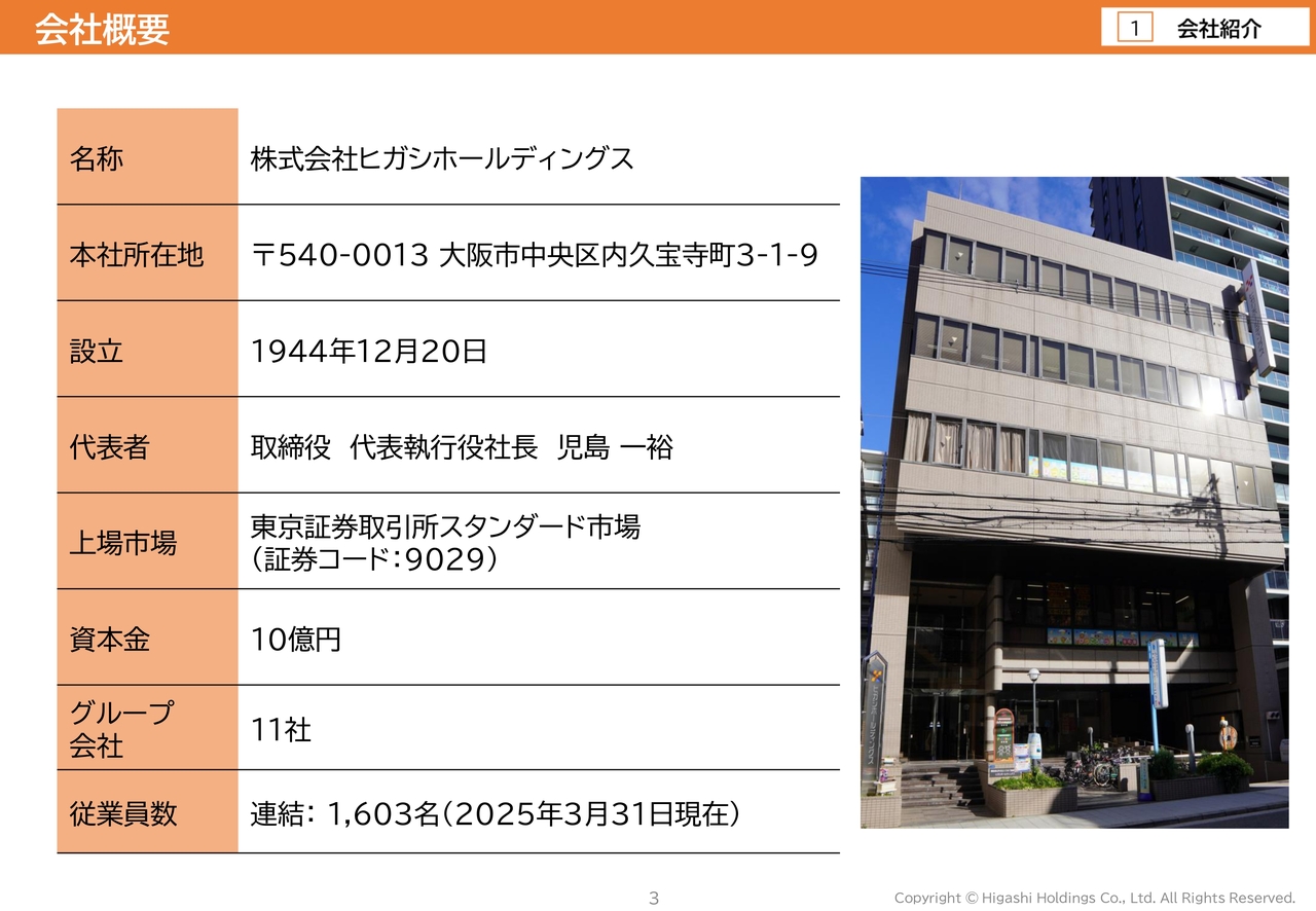 児島:会社概況をご紹介します。ヒガシホールディングスの本社機能は大阪市中央区の自社ビルにあり、現在、11社のグループ会社を有しています。グループ売上高は2025年3月期で481億円、従業員数は約1,600名です。