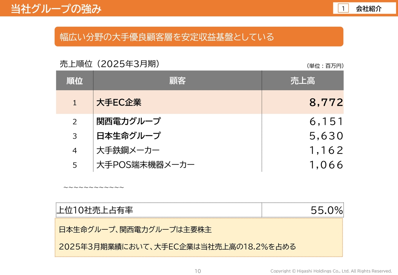 児島:当社グループの強みは、幅広い分野の大手優良顧客層を安定収益基盤としている点です。スライドをご覧いただくとおわかりのとおり、当社の主要顧客は日本生命や関西電力などの主要株主を中心とした大手優良企業であり、2025年3月期においては上位10社の売上が全体の55.0パーセントを占めています。