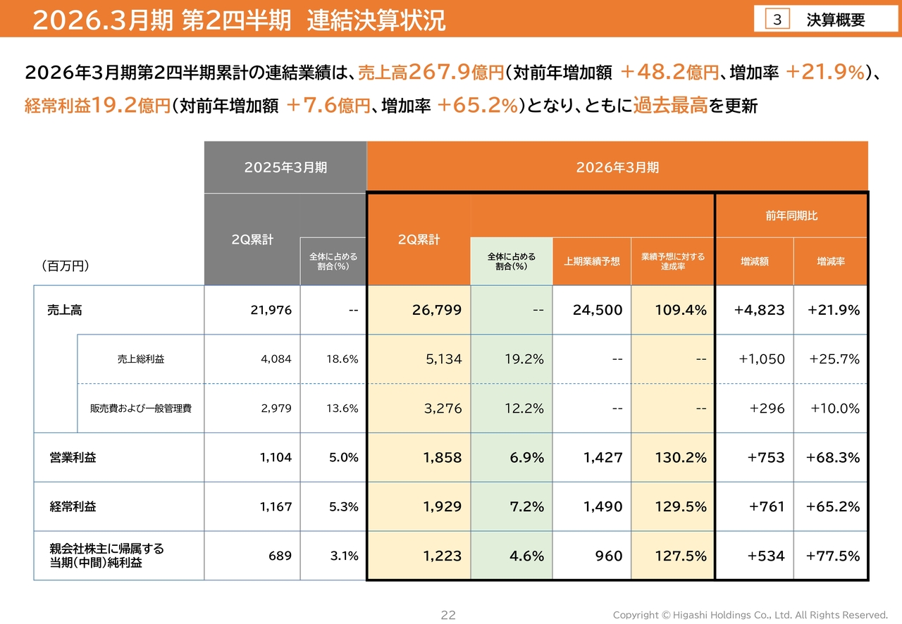 2026年3月期第2四半期累計の連結業績について、売上高、経常利益ともに過去最高を記録しました。具体的な数字として、売上高は前年同期比21.9パーセント増の267億9,900万円、営業利益は前年同期比68.3パーセント増の18億5,800万円、経常利益は前年同期比65.2パーセント増の19億2,900万円、親会社に帰属する当期純利益は前年同期比77.5パーセント増の12億2,300万円となっています。