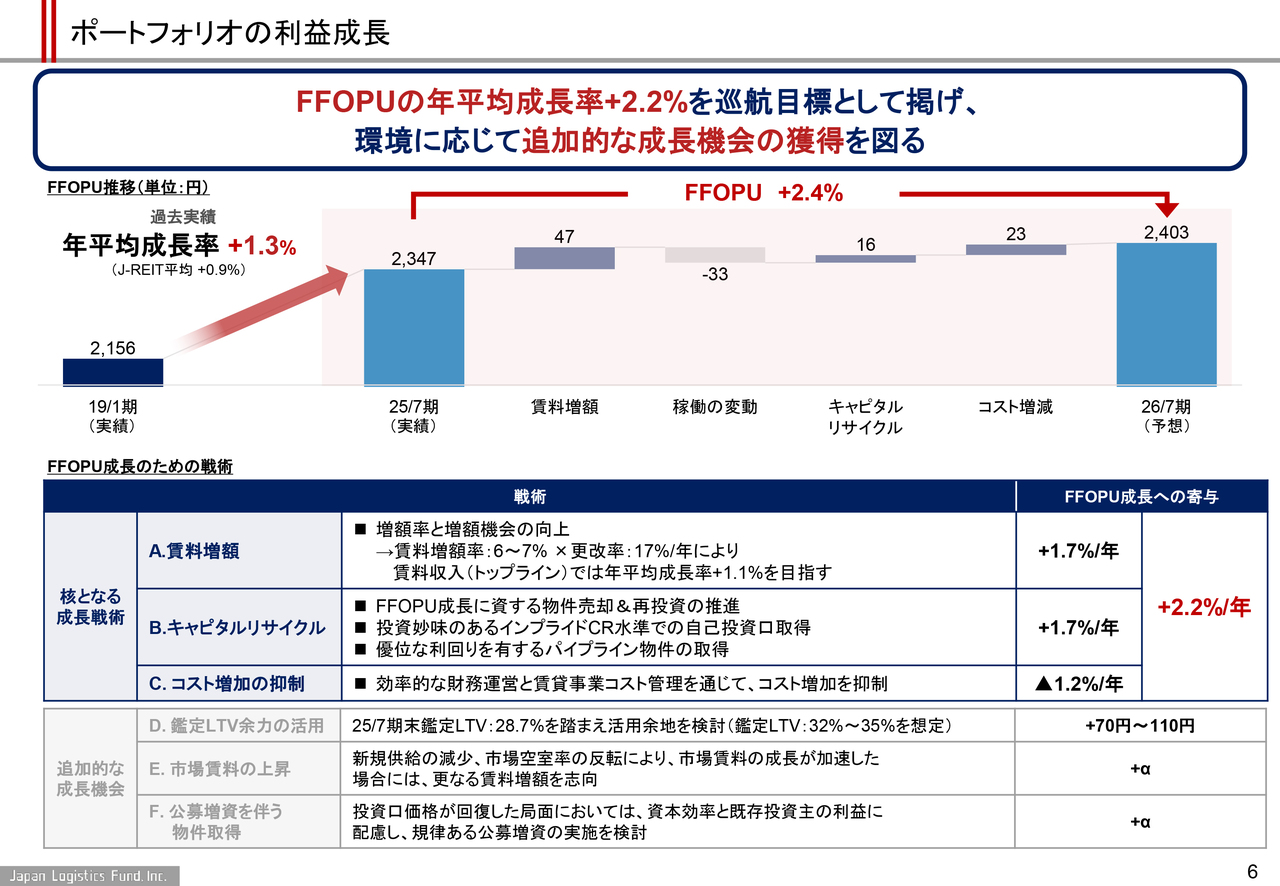 FFOとは「Funds From Operation」の略で、不動産売却益などの影響を控除したファンドが生み出す経常的なキャッシュフローを指します。年率2.2パーセントの成長目標は、過去6年半のJ-REIT平均や日本ロジの実績を大きく上回る意欲的なものです。