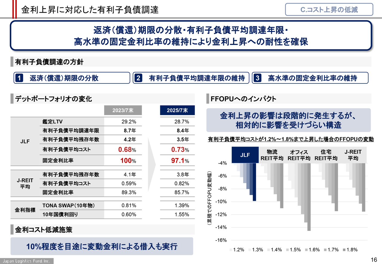 今後の金利コスト上昇に対応するため、有利子負債の約10パーセントを目安として変動金利による借入も選択肢としています。