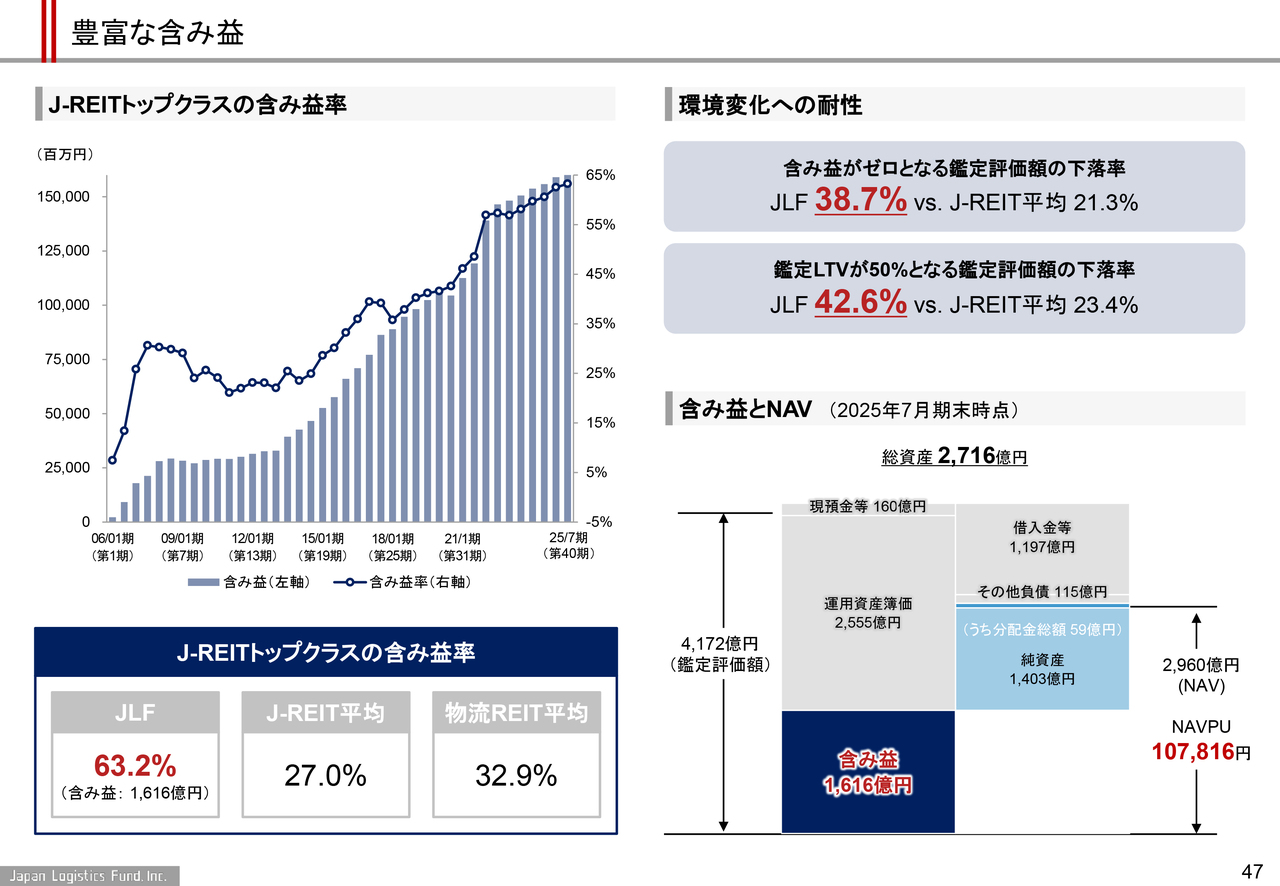 鈴木:日本ロジの2つ目の大きな特長は、豊富な含み益です。日本ロジは、好立地のポートフォリオと長年の堅実な運用を背景に、J-REIT全58銘柄の中で最も高い含み益率を有しています。含み益とは、不動産の帳簿価格に対して鑑定評価額、すなわち時価がどれだけ上回っているかを示す指標です。日本ロジの含み益率は63.2パーセントであり、J-REITの平均である27パーセントや物流REITの平均である32.9パーセントに比べ、非常に高い水準となっています。