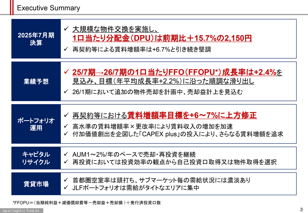 日本ロジスティクスファンド投資法人を、本日は略称として「日本ロジ」と呼ばせていただきます。日本ロジの概要や特長のご紹介と、足元の成長戦略について、直近の2025年7月期の決算説明会資料を用いてご説明します。
