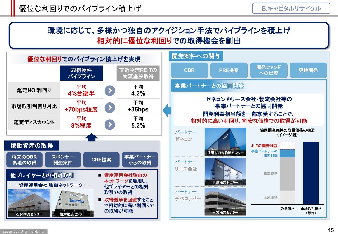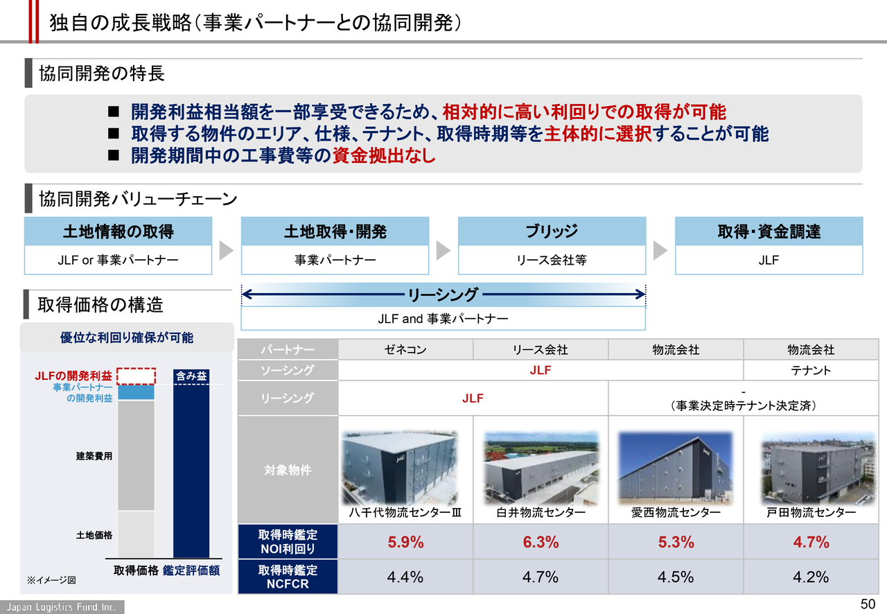 スライド左下の図をご覧ください。通常、デベロッパーが開発した物件をREITが取得する場合、取得価格は土地代と建築費用にデベロッパーの開発利益を足し合わせたものとなります。しかし、この取組みでは、日本ロジがパートナー企業に対して開発のサポートを行うため、その分日本ロジが事業パートナーに支払う開発利益を低く抑えることができます。