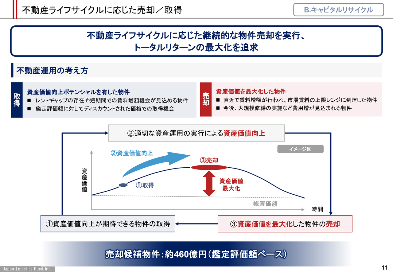 また、資産価値を最大化した物件については、私どもの運用によって賃料ギャップを解消した物件や、不動産ライフサイクルの中で中期的に維持費の上昇が見込まれ、収益性の低下につながる可能性のある物件を指しています。これらの物件は、主にキャッシュフローの観点から判断しています。