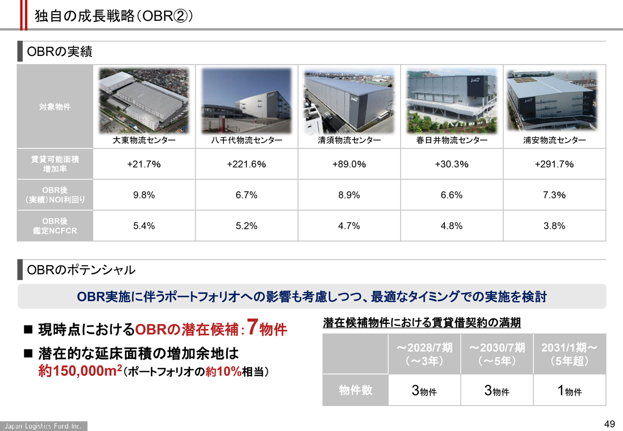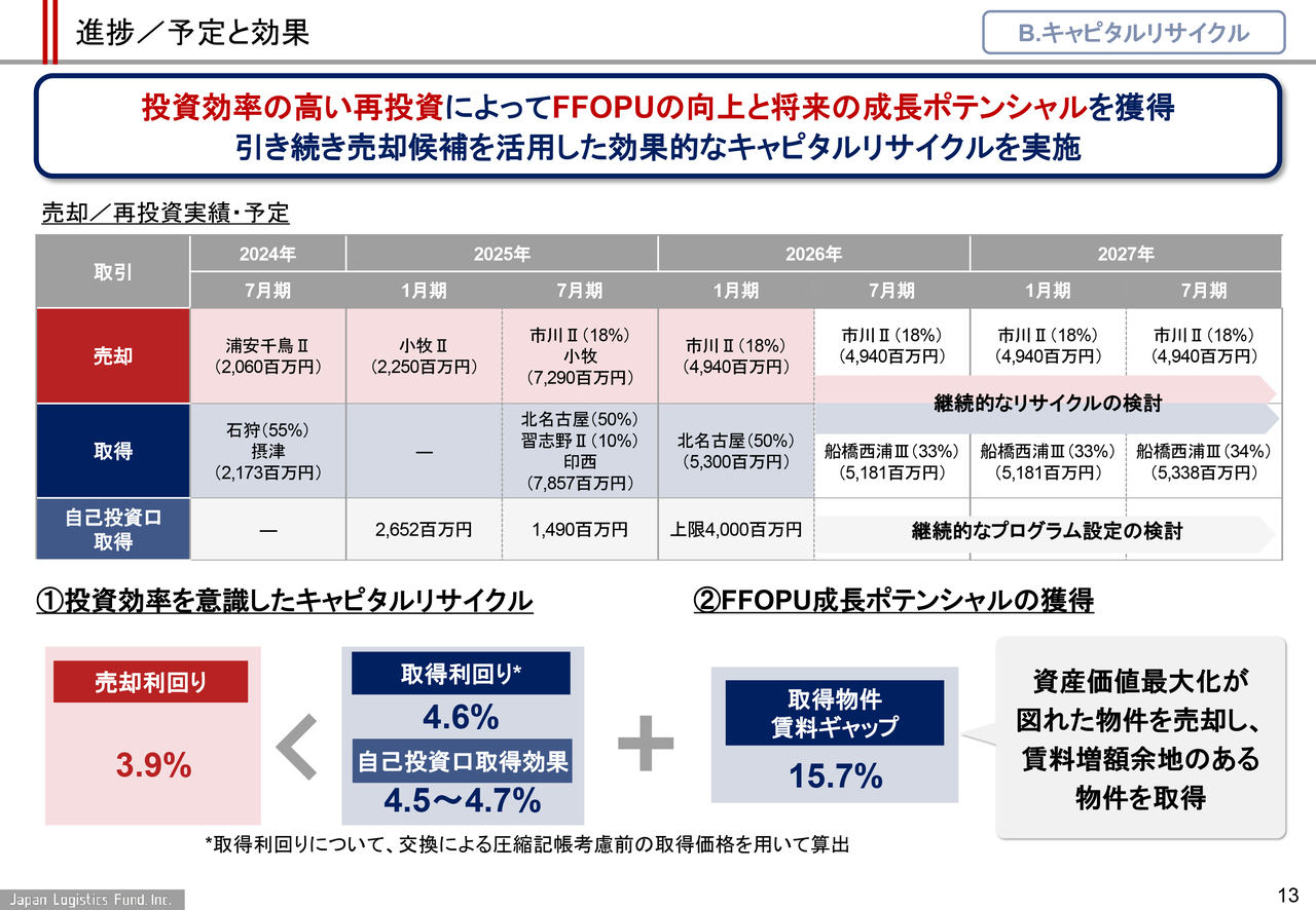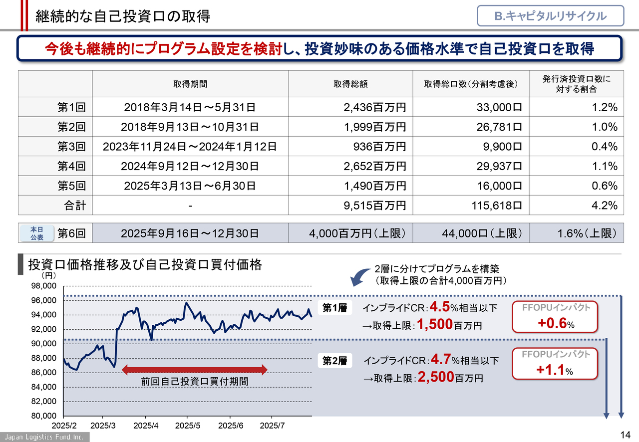 今期は買付限度額40億円、発行済投資口数の約1.6パーセントの枠を設定し、12月末にかけて実施しました。自己投資口の取得は他の銘柄でも行っていますが、日本ロジでは再投資として位置づけている点に特長があります。