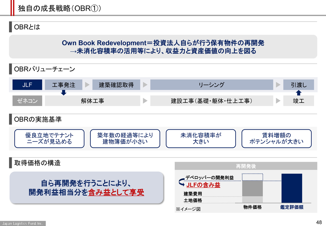 具体的には、当社が保有している物件をバランスシートに残したまま再開発を行うという内容です。再開発により賃貸面積を拡大したり、賃料を引き上げられる最新のスペックを備えた物件に建て替えることで、収益性を向上させることを目指した取組みです。