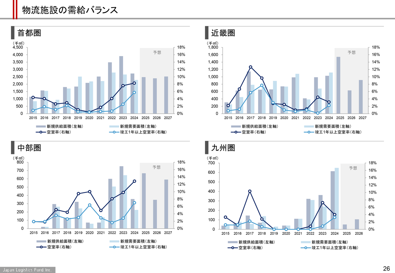 鈴木:こちらは、今後の物流施設の建設について、地域別の需給バランスと空室率を示したスライドです。左上の最大市場である首都圏について、グラフの縦軸が需要と供給を表しています。2023年には大量の供給があり、その影響で現在、空室率が上昇している状況です。しかし今後の見通しとしては、空室率が大きく低下すると予測されています。