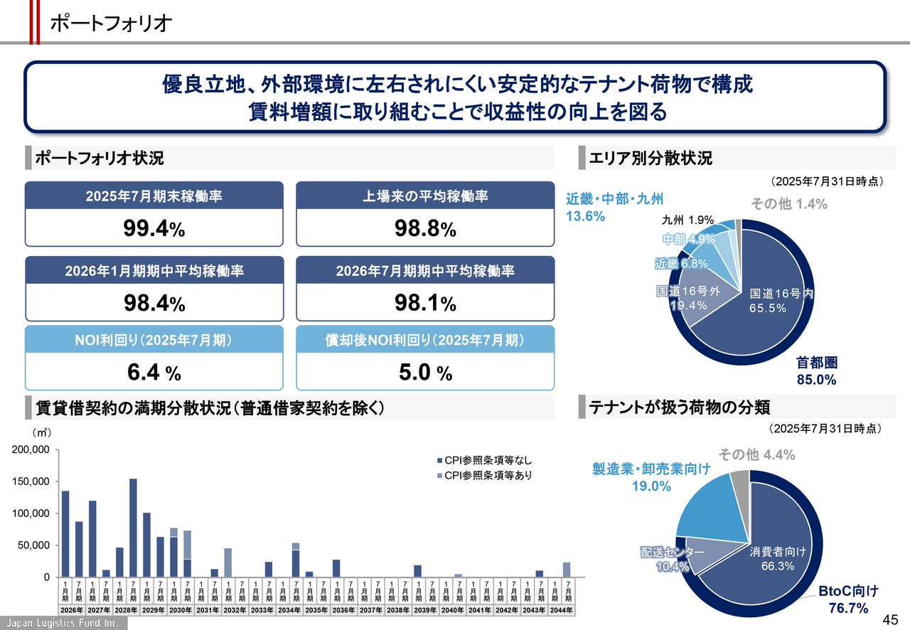 鈴木:こうした立地優位性を活かした運用の結果、運用資産の上場以来の平均稼働率は98.8パーセントと、極めて高水準を維持しています。また、右下のグラフのとおり、テナントが取り扱う荷物のうち、全体の76.7パーセントが日用品やEC関連といった消費者向け、すなわちBtoC向けの荷物です。