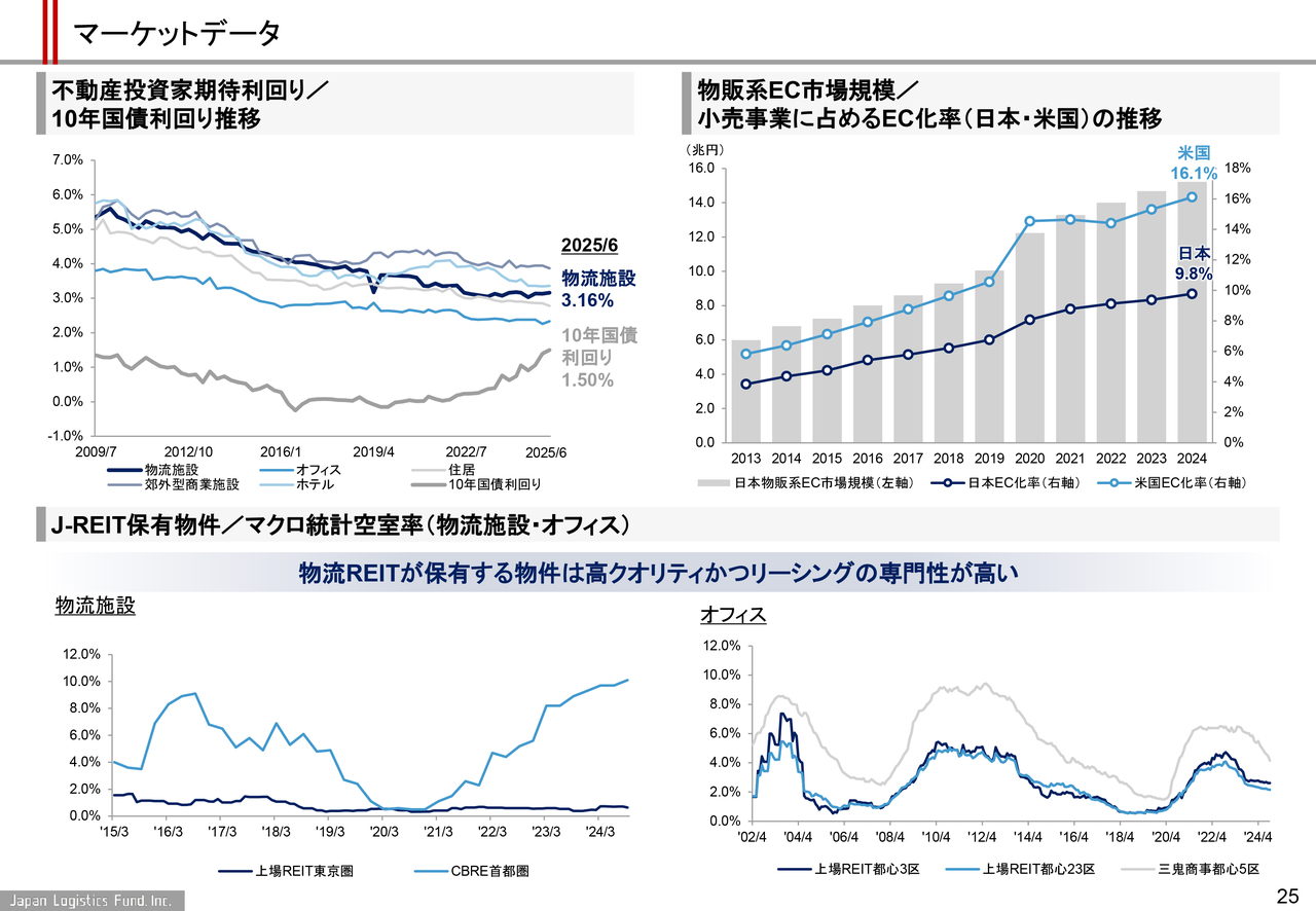 鈴木:現在、賃料増額は十分狙える環境にあると考えています。スライドの25ページをご覧ください。下段の空室率の推移のグラフですが、左側が物流施設、右側がオフィスです。左側の物流施設のグラフを見ていただくとわかるように、首都圏の物流施設の空室率は約10パーセントまで上昇しており、過去の推移と比較しても比較的高い水準です。