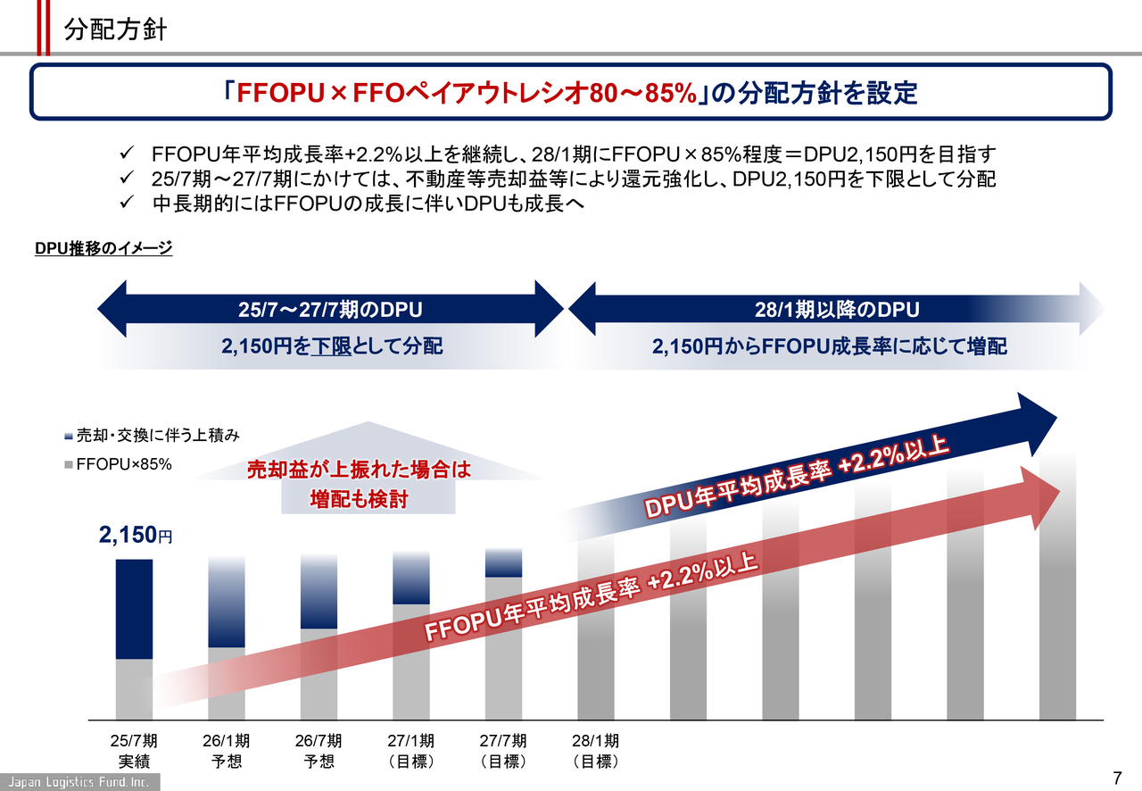 この期間中にキャッシュ創出力をしっかりと高め、2028年1月期以降は1口当たりFFOの成長に連動するかたちで、分配金を安定的に成長させるイメージを描いています。