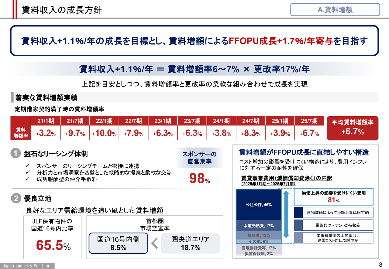 鈴木:賃料収入の成長方針についてご説明します。賃料収入について、年率1.1パーセントの成長目標を設定しています。これを利益ベース、すなわち1口当たりFFOに換算すると、先ほどご説明した1.7パーセントの成長率となります。賃料収入の成長は再契約などにおける賃料増額率と賃料更改率の掛け算で算出し、増額率は6パーセントから7パーセント、賃料更改は年間17パーセントを目安に運用しています。