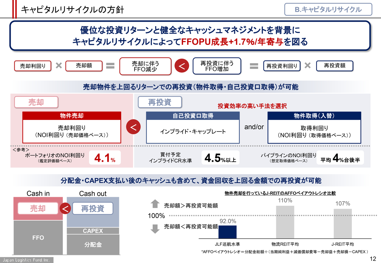 再投資の「規模」については、スライド下段左側のイメージ図にあるように、ファンドからのキャッシュアウトとなる分配金およびCAPEXの合計を、キャッシュインであるFFOの範囲内でコントロールすることで、物件売却によって回収した資金を上回る金額を再投資に充てることが可能です。