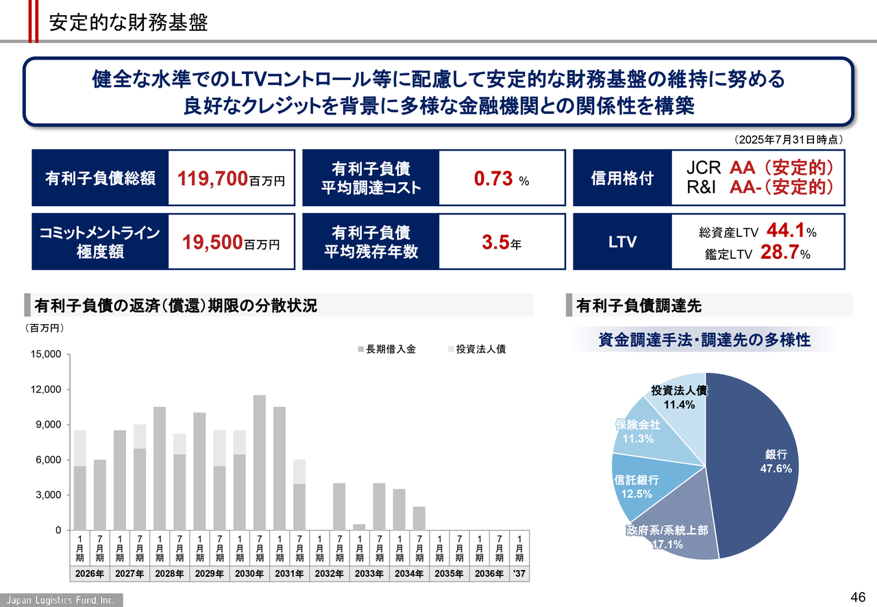 鈴木:財務基盤も極めて安定しています。日本ロジは、日本格付研究所(JCR)からAA、格付投資情報センター(R&I)からAAマイナスという高水準の信用格付けを付与されており、J-REITの中で高い信用力を有しています。借入金などの有利子負債については、左下のグラフに示されているように満期の分散が図られており、リファイナンスのリスクや金利上昇による影響の低減が実現されています。