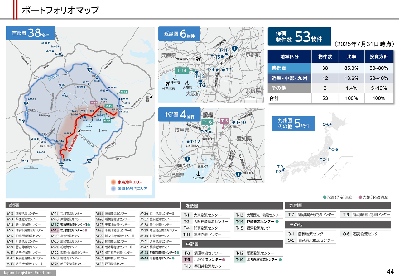 この比率は、他の物流REITと比較して圧倒的に高い水準です。他の物流REITでは、国道16号の内側に立地する物件の割合は20パーセントから30パーセント台にとどまっています。