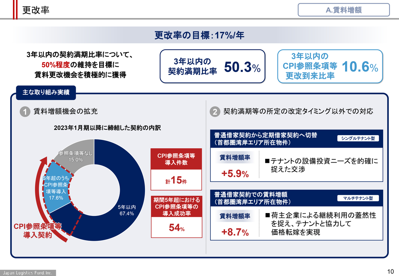 今後も満期時の再契約対応に加え、CPI参照条項に基づく賃料改定やその他の改定機会の創出など、多様なアプローチを検討しつつ、年間17パーセント程度の賃料更改率を目安に運用していきます。