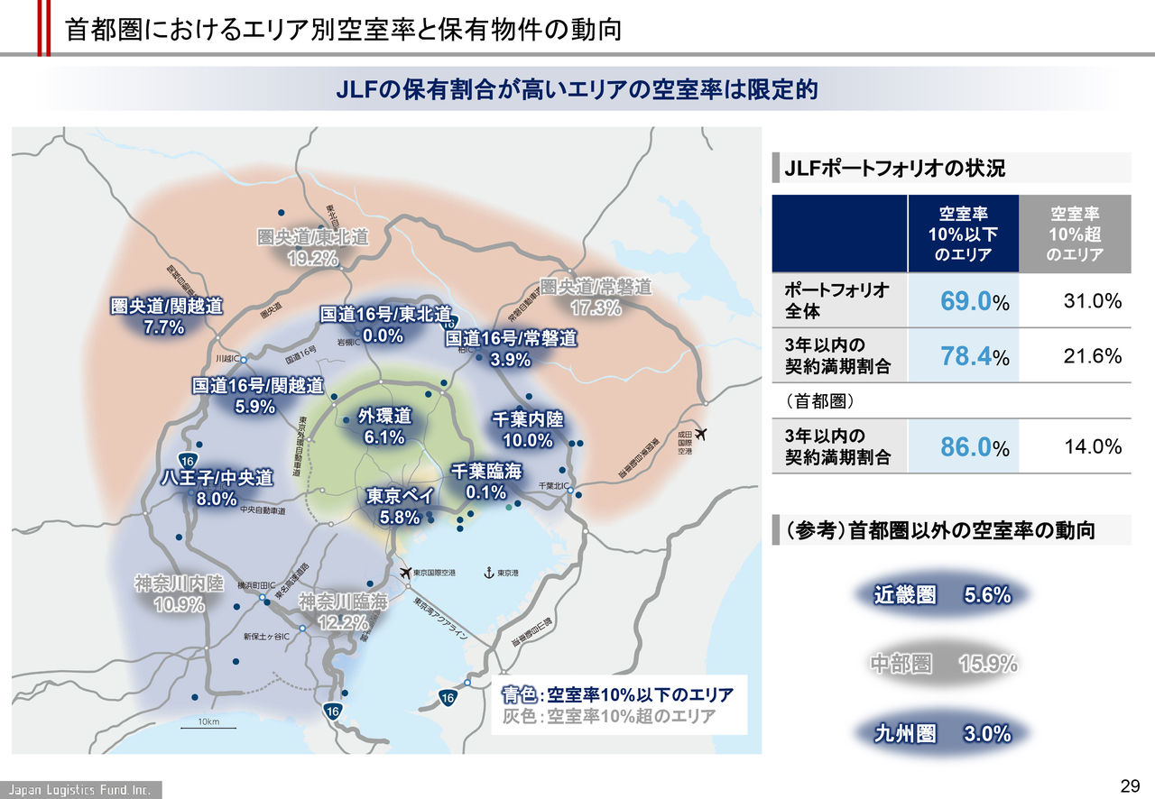 鈴木:29ページもご覧ください。都心に近いエリアほど空室率が低く、外縁部や圏央道の一部エリアでは空室率が高くなっています。日本ロジのポートフォリオ全体では、空室率10パーセント以下のエリアが69パーセントを占めています。また、78.4パーセントの物件が今後3年以内に契約満期を迎える予定です。これらの物件については積極的に賃料増額を行い、収益向上を図っていきます。