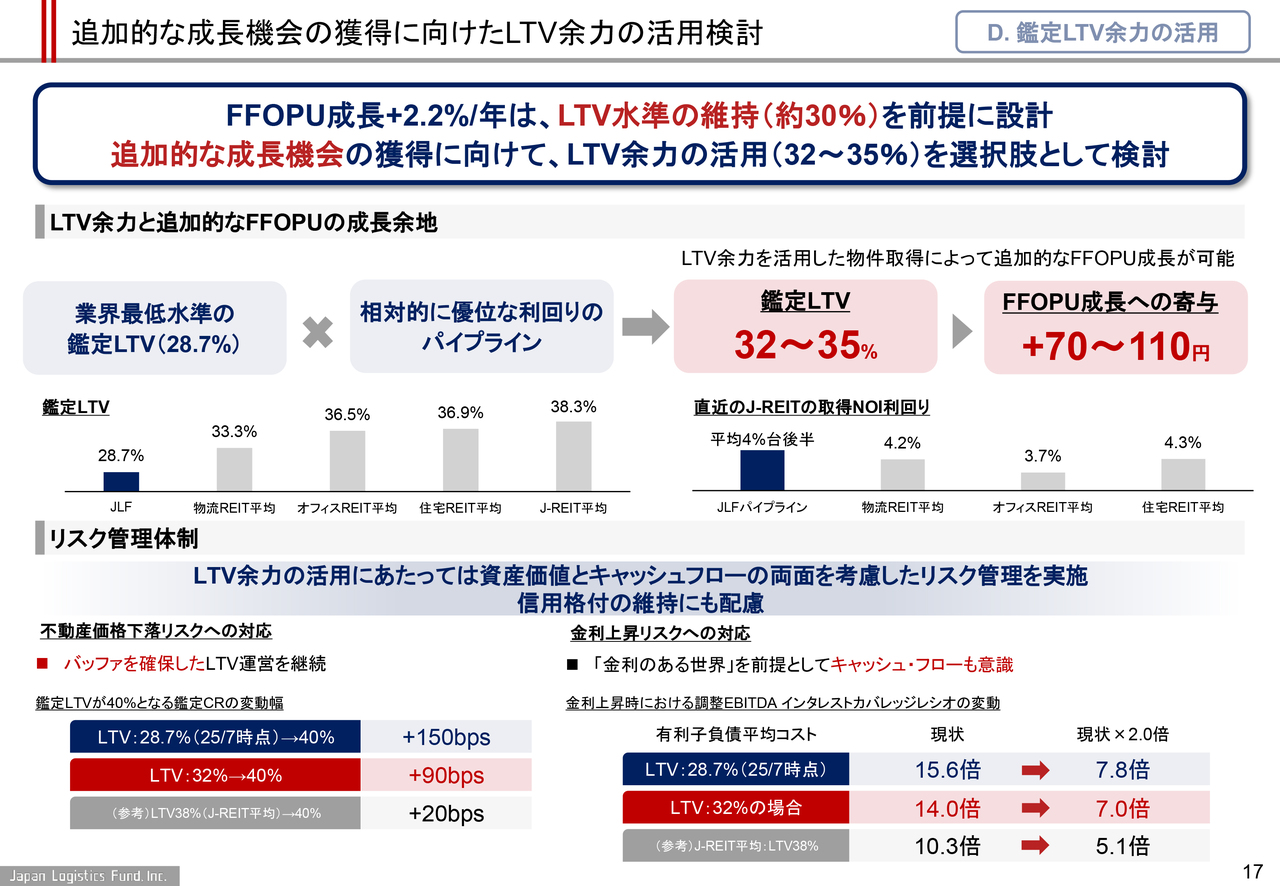 年率2.2パーセントの1口当たりFFO成長は、現行のLTV水準を維持することを前提としています。しかし、この余力を活用し、相対的に優位な利回りを確保できるパイプラインから物件を取得することで、1口当たりFFOを70円から110円程度成長させることが可能と考えています。