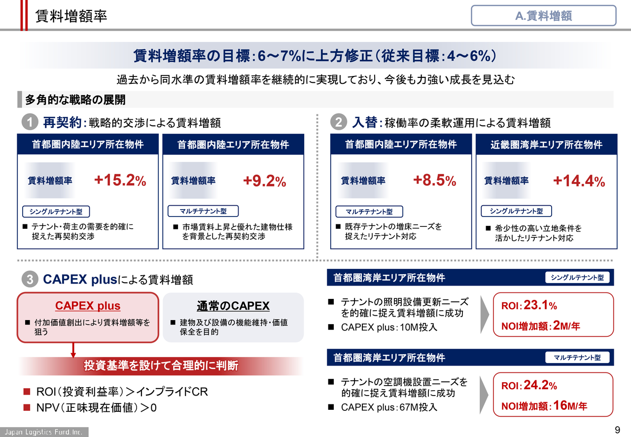 具体的には、賃料増額において、これまでよりもさらに高い目線でアクセルを踏み込むとともに、キャピタルリサイクルを継続し、資本効率およびポートフォリオの収益性の向上を進めています。