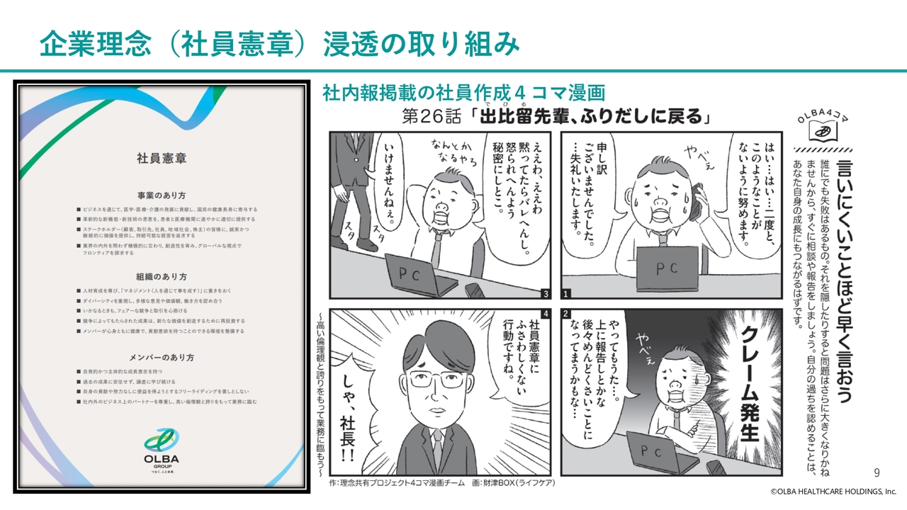 しかし、これを浸透させることが難しいため、現在、より簡単な方法として、ほぼ毎月発行する社内報の中で4コマ漫画を掲載し、そこで企業理念を取り上げ、社員に理念をわかりやすく共有するなどの取り組みを継続しています。