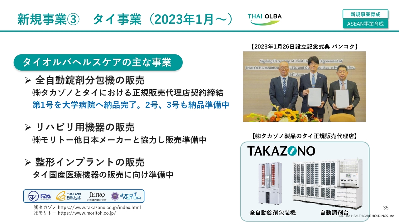 前島:海外事業についてです。こちらはタイで展開している事業で、2023年からスタートしたタイオルバヘルスケアという会社です。現在、全自動錠剤分包機をタイの国立病院に販売しており、第1号が納品され、第2・3号も納品準備中です。