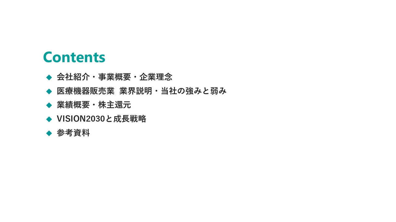 前島:本日は、会社紹介、事業概要、企業理念、医療機器販売業の業界説明、当社の強みと弱み、業績概要と株主還元、最後に長期展望「VISION2030」と成長戦略についてご説明します。