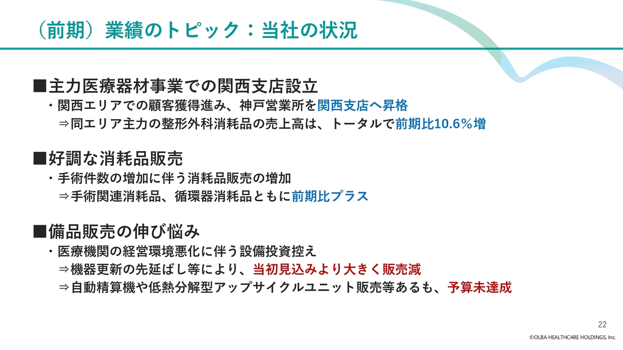 前島:当社の業績に関するトピックと状況について、3点ご説明します。1点目に、主力医療器材事業において、関西支店を設立しました。関西エリアでの顧客獲得が進み、神戸営業所を関西支店へ昇格しました。その結果、関西エリアの主力である整形外科消耗品の売上高は前期比で10.6パーセント増加し、成長を遂げています。
