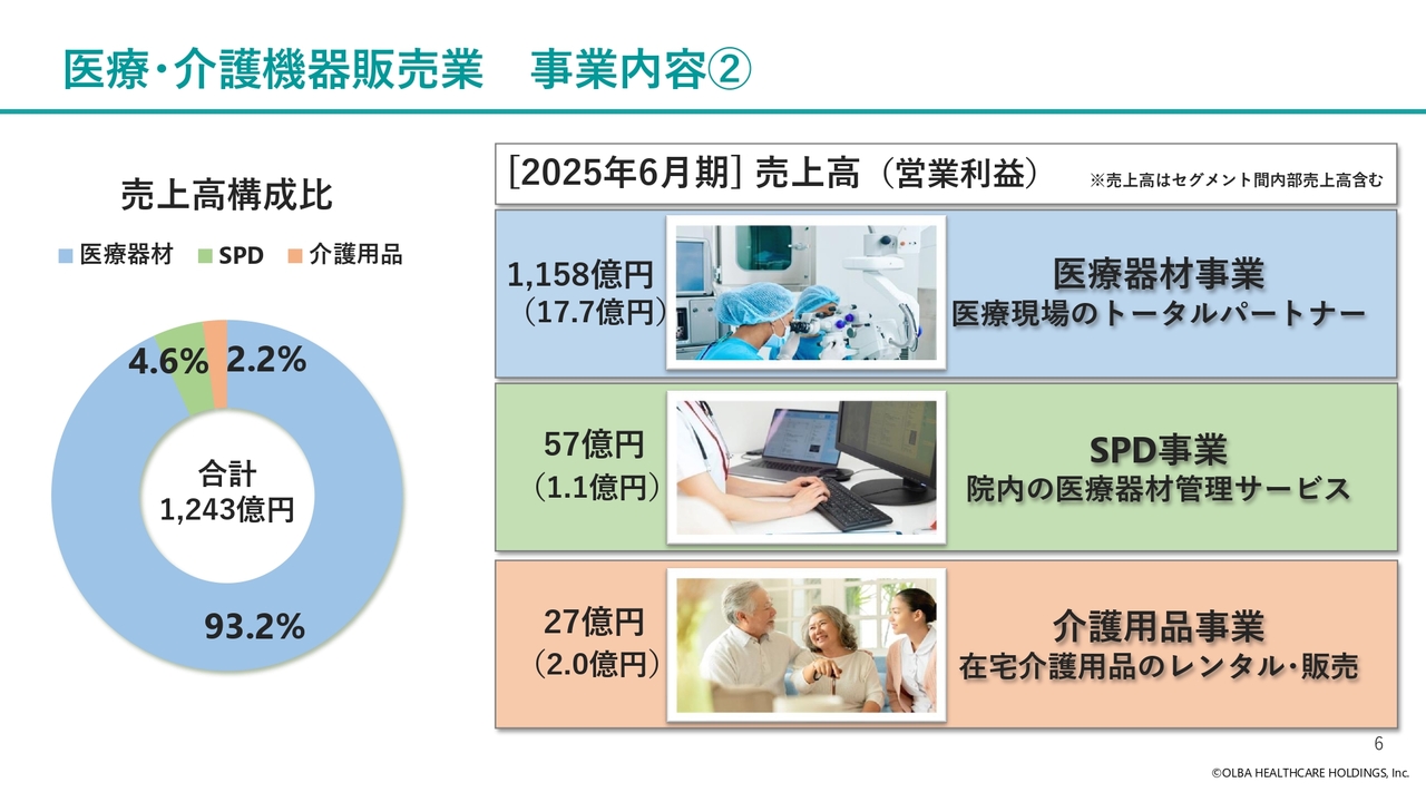 前島:当社の事業セグメント別の売上高と営業利益についてです。93.2パーセントが医療器材販売事業で、SPD事業が4.6パーセント、介護用品事業が2.2パーセントという状況です。