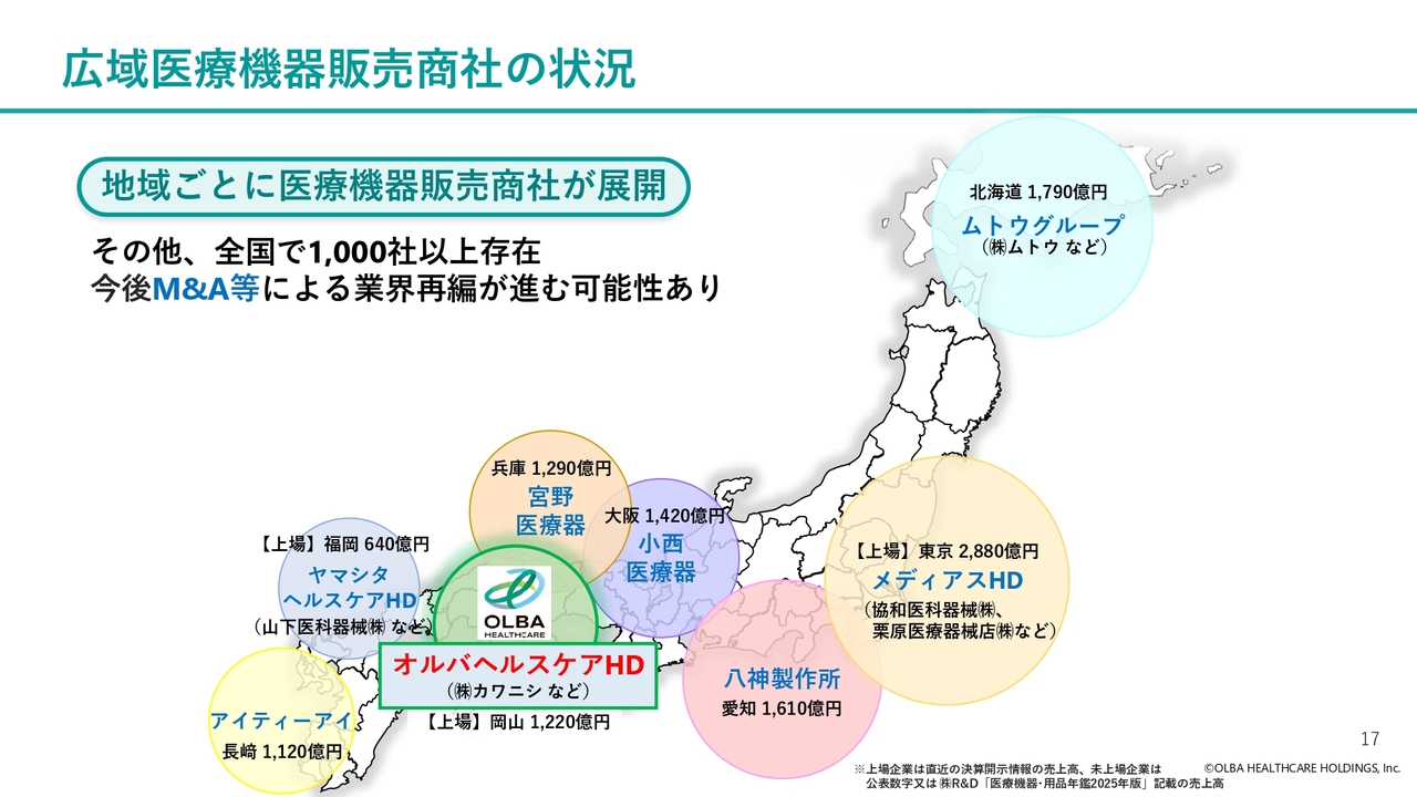 前島:スライドは広域医療機器販売商社の状況です。全国には地域ごとに1,000社以上の医療機器販売商社があり、大手の会社も存在します。今後、M&A等による業界再編が進む可能性も考えられます。