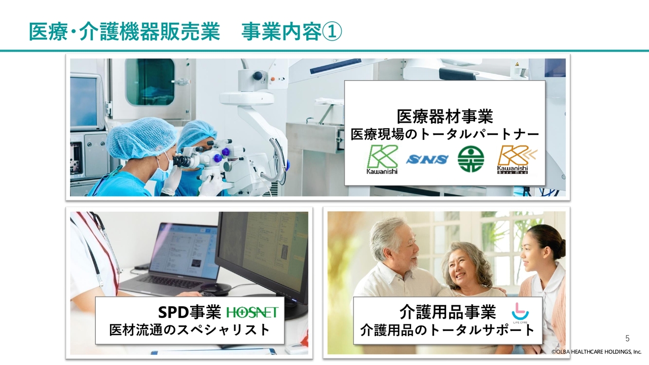次にSPD事業については、医療材料流通のスペシャリストということで、ホスネット・ジャパンが担当しています。そして介護用品事業は主に在宅介護を対象としており、介護用品のトータルサポートを行う事業で、ライフケアが担当しています。