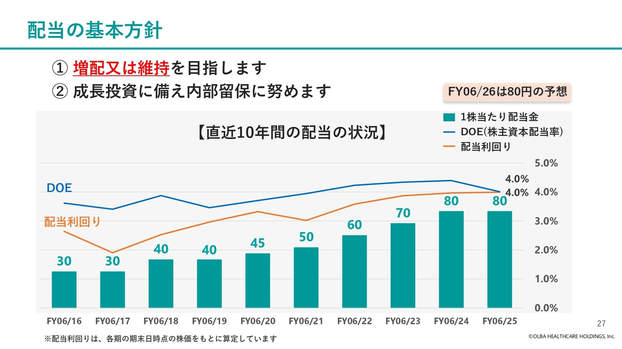 1株当たりの配当金は、増配あるいは維持という方針のもと、前期は80円となっており、2026年6月期も引き続き80円の配当を予想しています。また、DOEは4パーセントと比較的高水準となっています。さらに、配当利回りも4パーセントと、同様に高水準で推移しています。