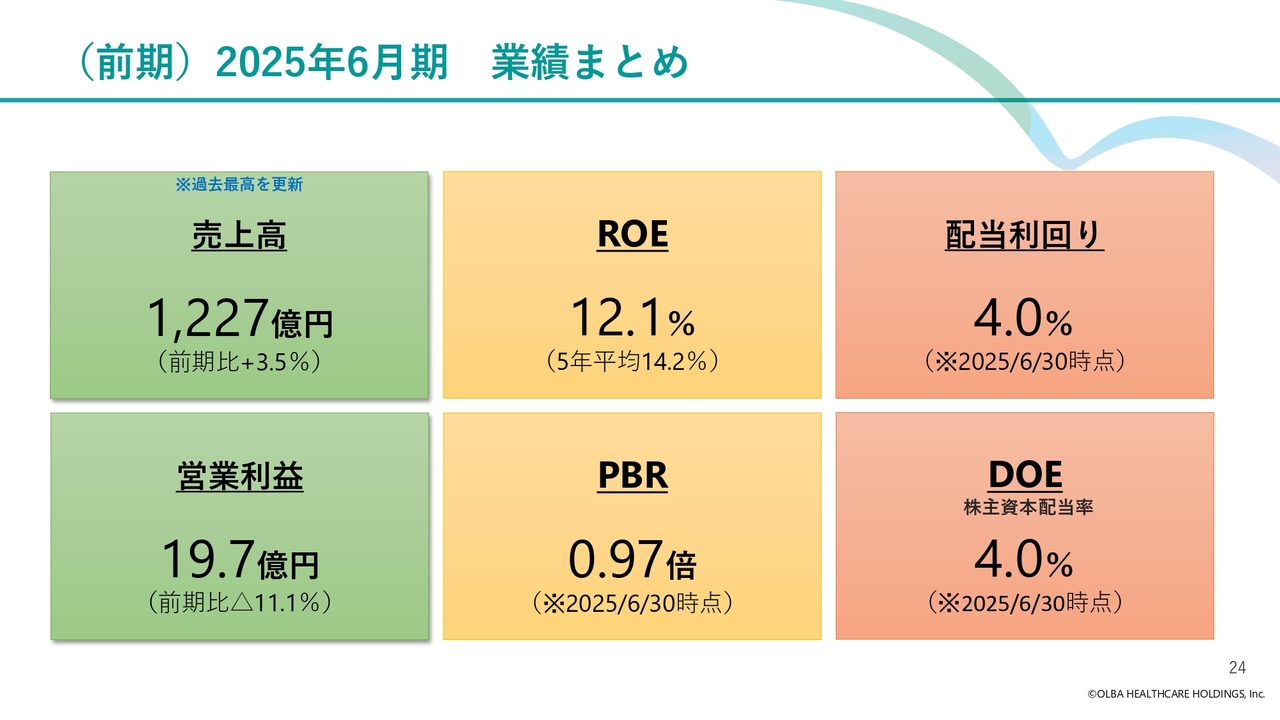 前島:前期の業績まとめです。ROEは12.1パーセントと比較的高い値となっています。また、PBRは若干1倍を割り込んで0.97倍です。配当利回りは4パーセントと比較的高い水準で、DOE(株主資本配当率)も4パーセントと同様に高い状況となっています。