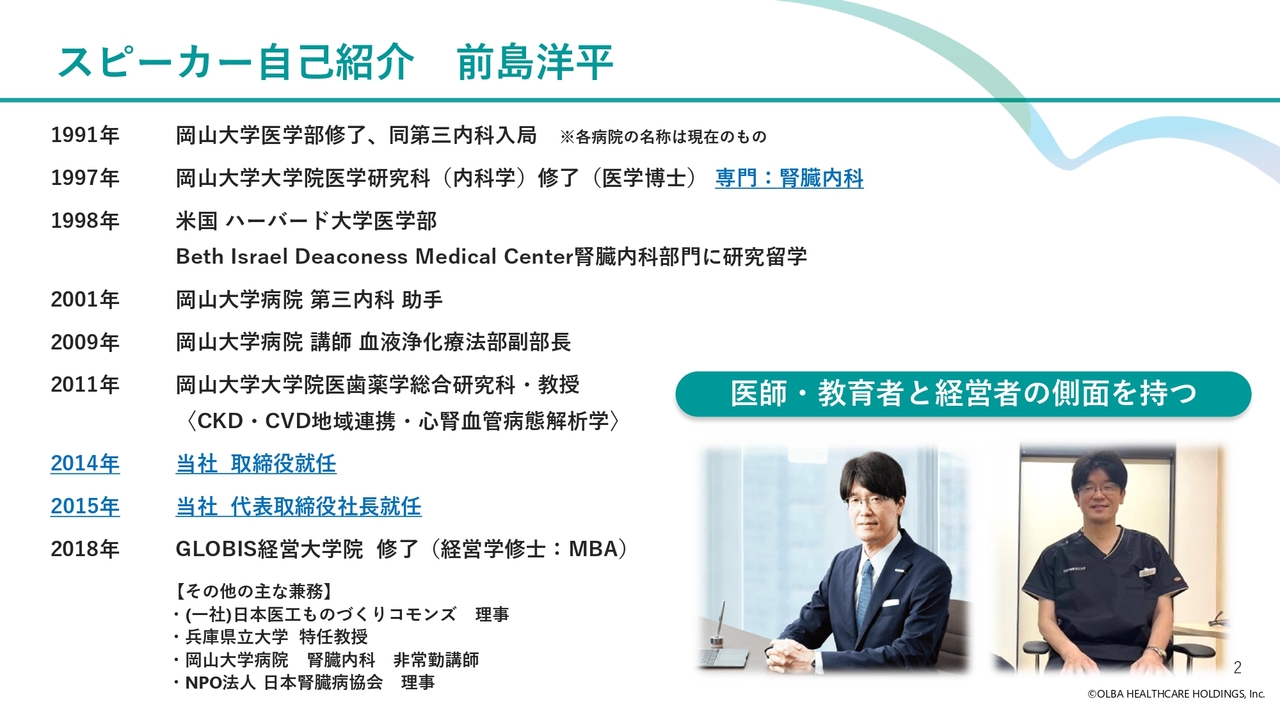 私の略歴です。私は少し異色の経営者で、もともと内科医をしていました。専門は腎臓内科で、岡山大学医学部を卒業後、大学院を修了し、アメリカのボストンにあるハーバード大学医学部附属病院に研究留学をしました。