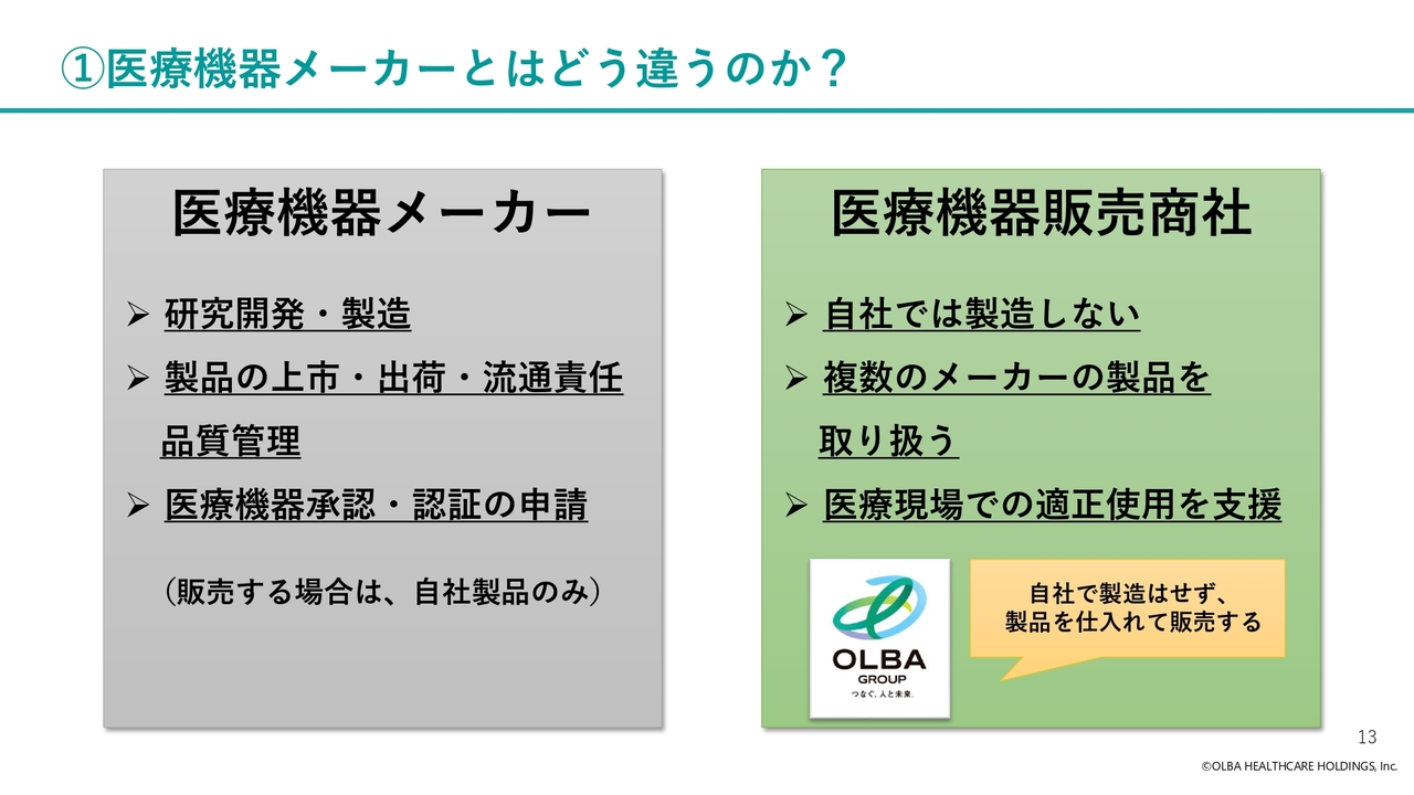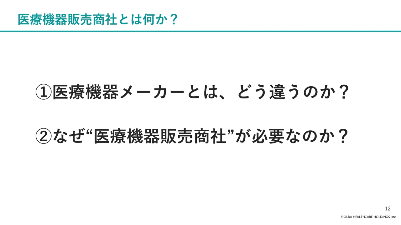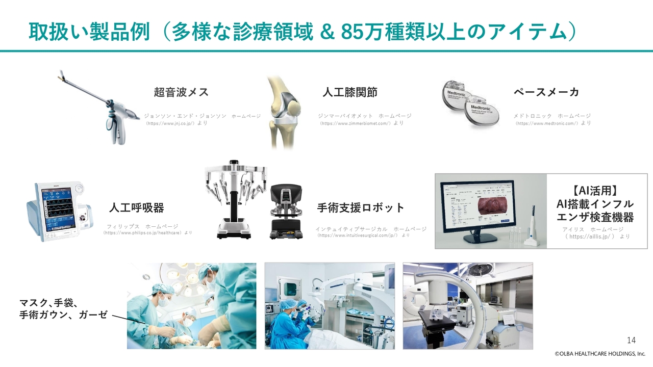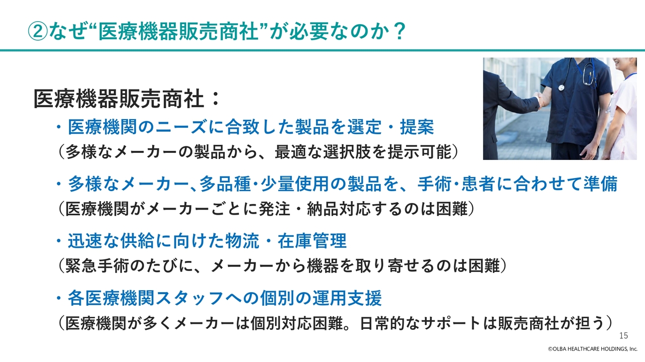 このようなご説明をする理由は、従来、投資家の方々が当社を「どのような手術機械を製造しているのか」とメーカーと混同されるケースがあったためです。加えて、当社をはじめとする医療機器販売商社の存在意義についてもお伝えしたいと考えています。