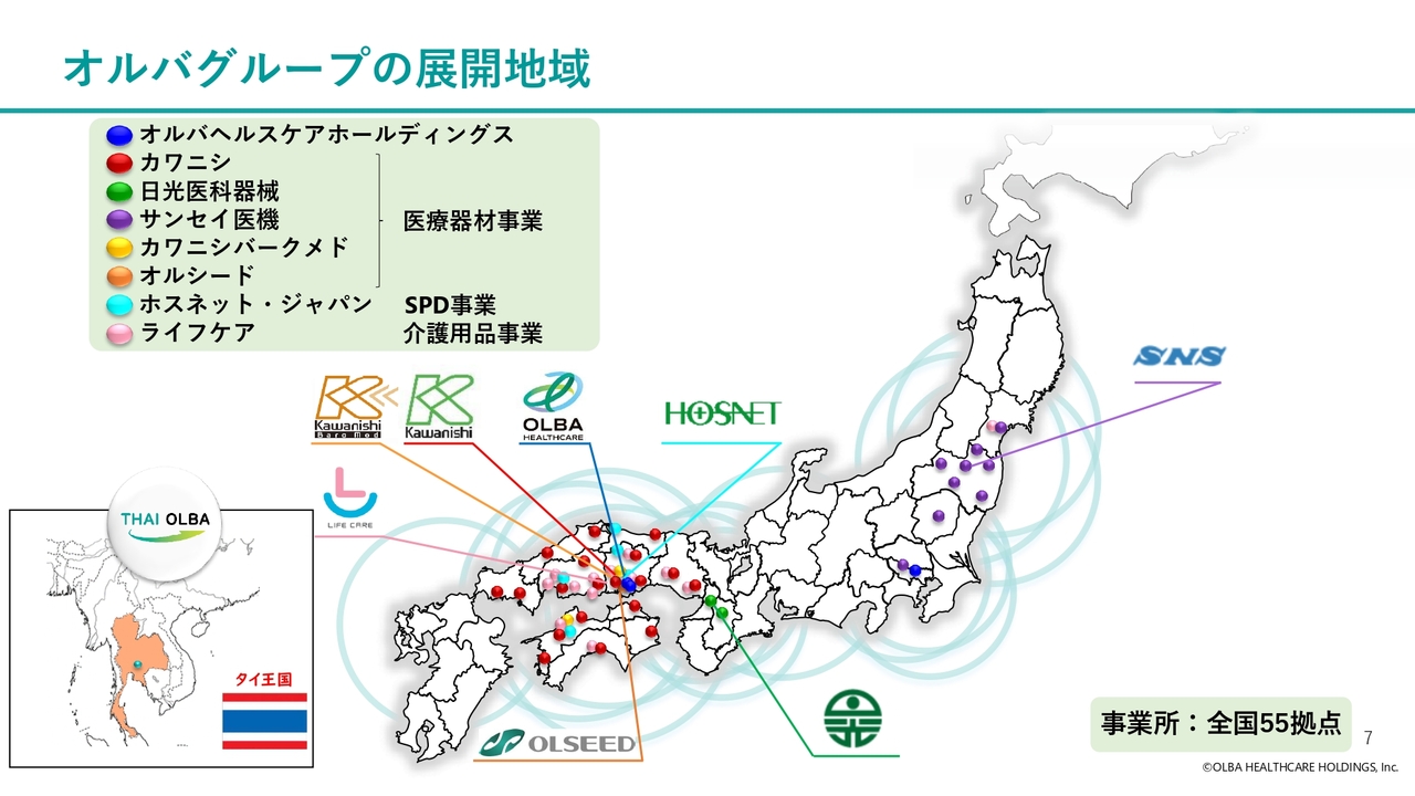 全国に55拠点を有しており、2023年にはタイにて合弁会社タイオルバヘルスケアを設立し、海外事業をスタートしました。また、オルシードという会社は、2025年1月に新しく設立された会社です。こちらの事業については後ほどご説明します。