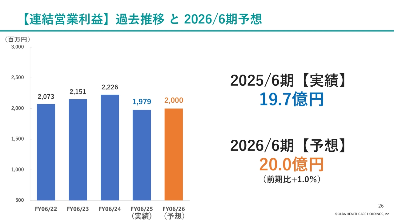前島:営業利益については、これまで順調に成長していましたが、前期は19億7,900万円という結果でした。今後、再成長を図るため、今期の目標を20億円と設定しています。