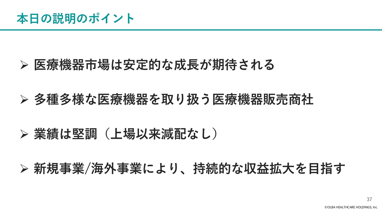 前島:本日のご説明のポイントです。医療機器市場は安定的な成長が期待されます。また、多種多様な医療機器が存在するため、それを取り扱う医療機器販売商社が必要です。
