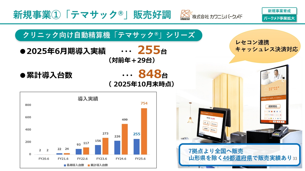 前島:新規事業のご紹介です。「テマサック」はクリニック向けの自動精算機で、前期には1年間で255台が導入されました。10月末時点で、全国で848台が導入されており、そのうち4割が関東圏です。また、山形県を除く46都道府県で販売実績があります。こちらはレセプトコンピューターと連携し、各種キャッシュレス決済にも対応しています。
