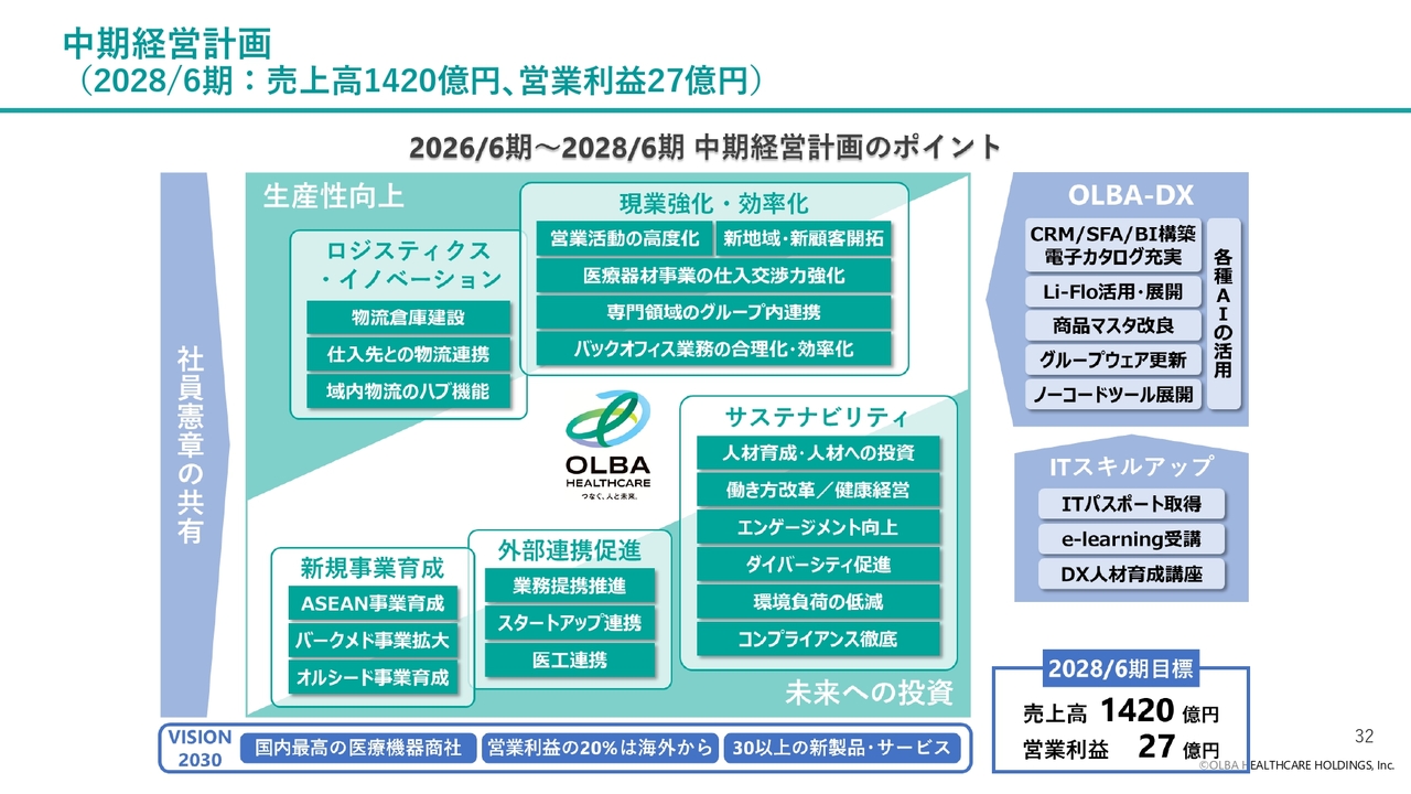 このような取り組みにより、2028年6月期には売上高1,420億円、営業利益27億円を目標としています。