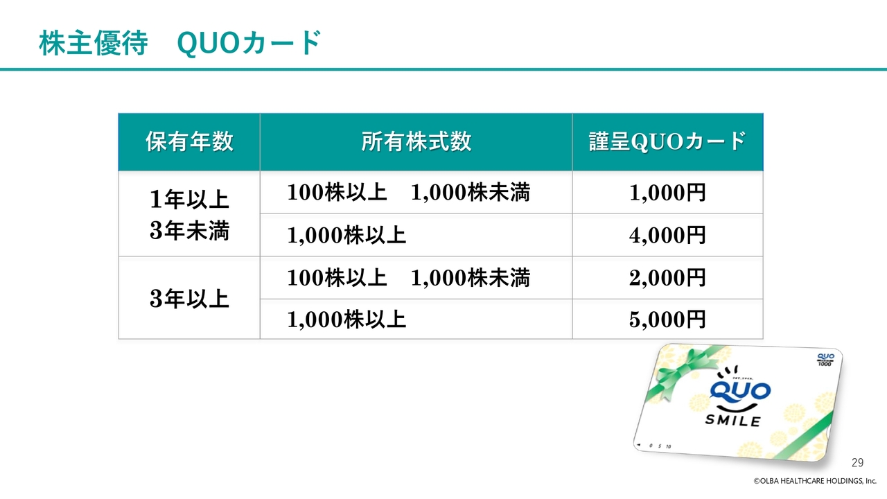 前島:株主優待についてです。株主優待は「QUOカード」で、1年以上株式を保有いただいた株主のみなさまに対し、保有年数および所有株式数に応じてスライドの額面の「QUOカード」をお贈りしています。