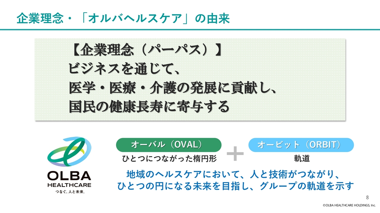 オルバは、楕円形を指す「オーバル」と軌道を意味する「オービット」を組み合わせた造語です。その意味として「地域のヘルスケアにおいて、人と技術がつながり、ひとつの円になる未来を目指し、グループの軌道を示す」という想いを込めています。