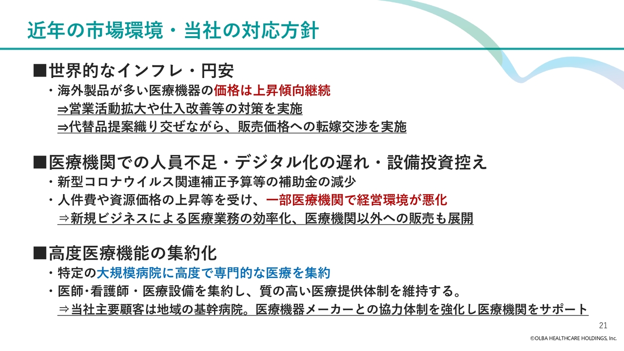 前島:業績の概要と株主還元についてです。まず、近年の市場環境と当社の対応方針として、世界的なインフレや円安の影響により、海外製品が多い医療機器の価格が上昇傾向にあります。これに対し、営業活動の拡大や仕入れ改善などの対策を講じています。また、代替品の提案を織り交ぜながら、販売価格への転嫁交渉も粘り強く進めています。