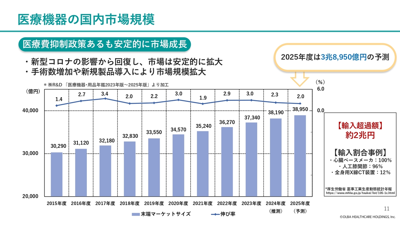 前島:医療機器販売業の業界説明と当社の強みと弱みについて解説します。スライドは日本の医療機器の国内市場規模に関する図です。2025年度の市場規模は3兆9,000億円弱と予測されています。また、グラフ上部の折れ線グラフは成長率を示しており、年間2パーセントから3パーセントの成長率が見込まれる市場です。