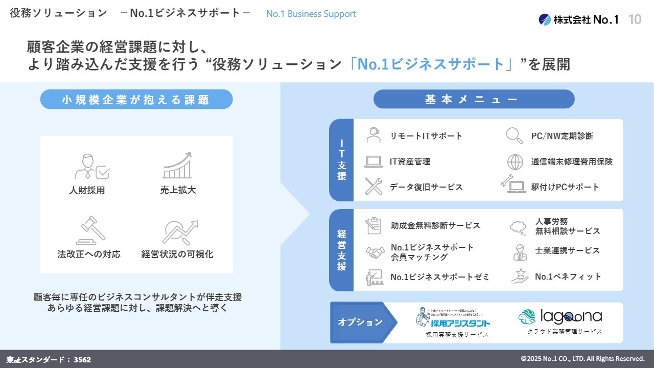 「No.1ビジネスサポート」では、これらの経営課題に対して、専任のコンサルタントがお客さまに寄り添い、伴走型で支援します。このサービスは、高い顧客満足度と安定的な収益基盤を生み出しています。