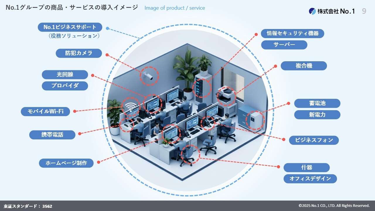 セキュリティ、通信環境、業務効率化ツールなど、企業の「心臓部」から「末端」に至るまで、あらゆる設備やサービスを当社グループだけで提供できます。この点が、当社の大きな強みであり、競合他社との差別化ポイントだと自負しています。